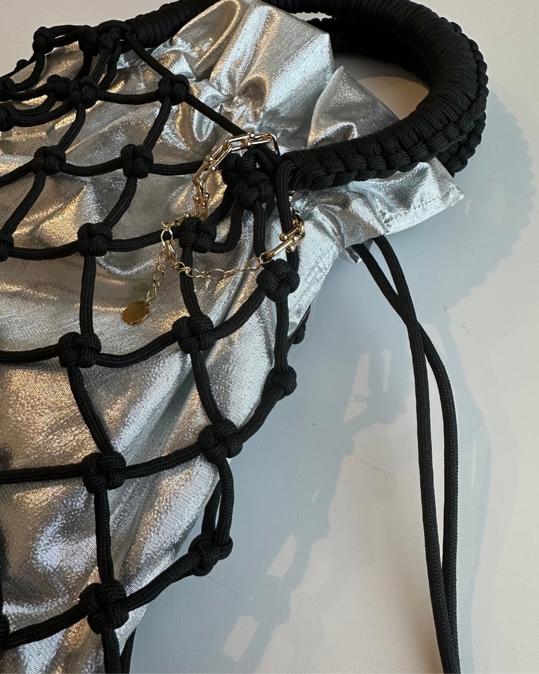 丁寧な手編みでお作りした黒のネットバッグに、シルバーの煌めきがオシャレな巾着を合わせました。