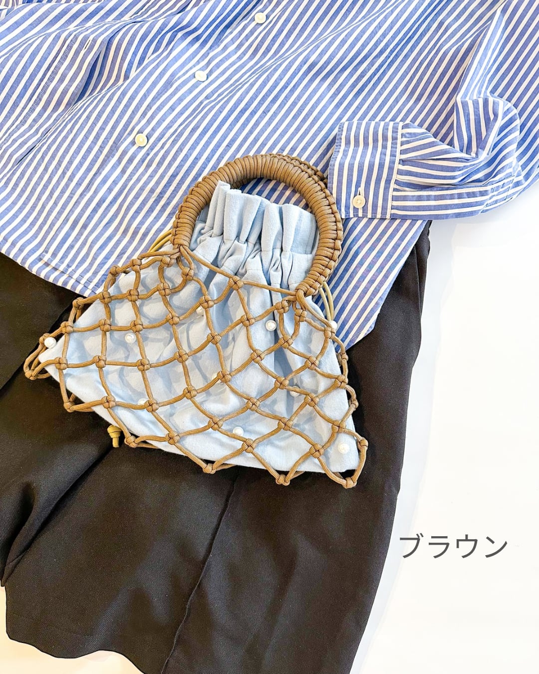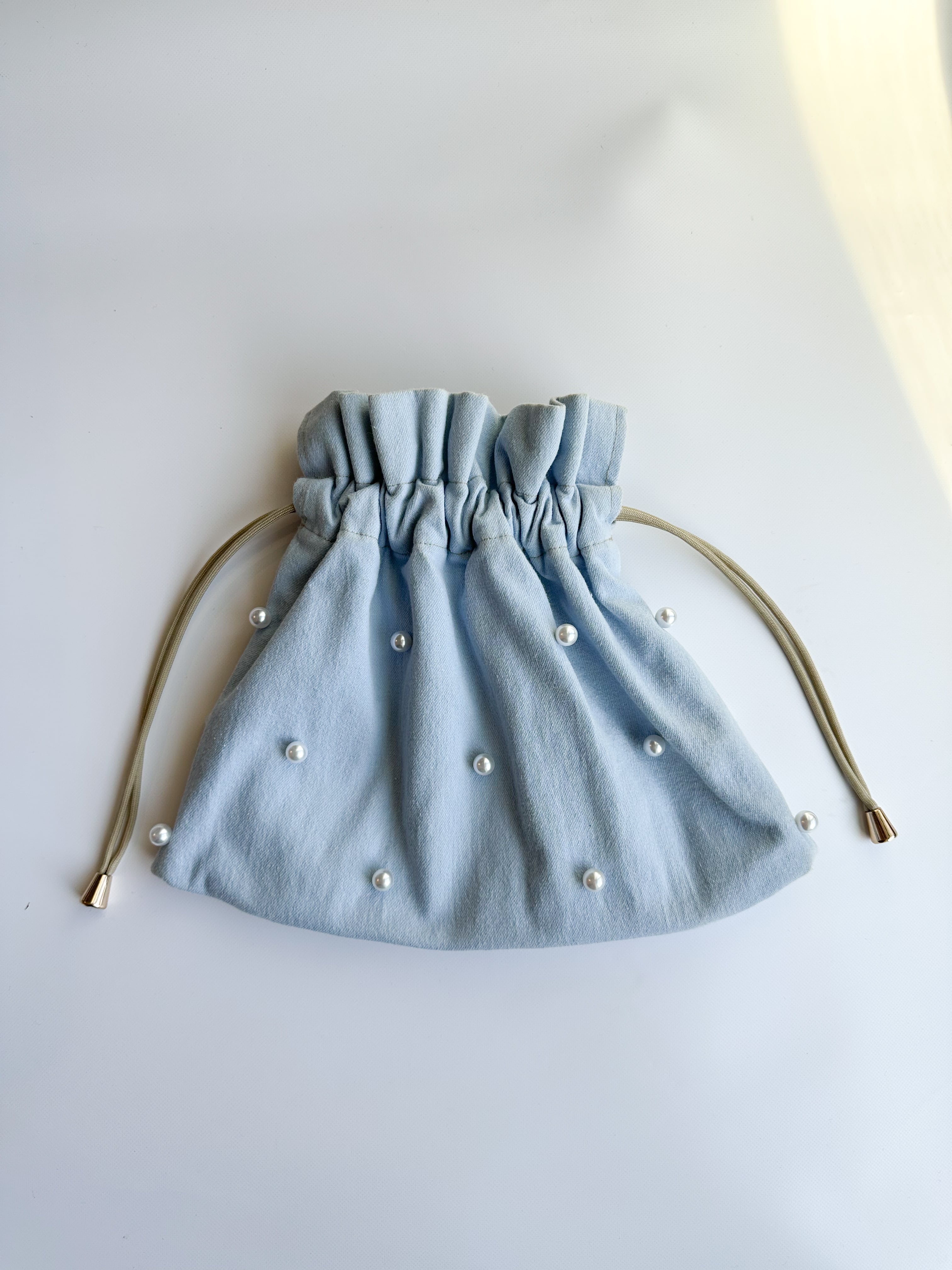 淡いカラーのデニム生地にパールを一粒ずつ装飾したトレンドをおさえた巾着。