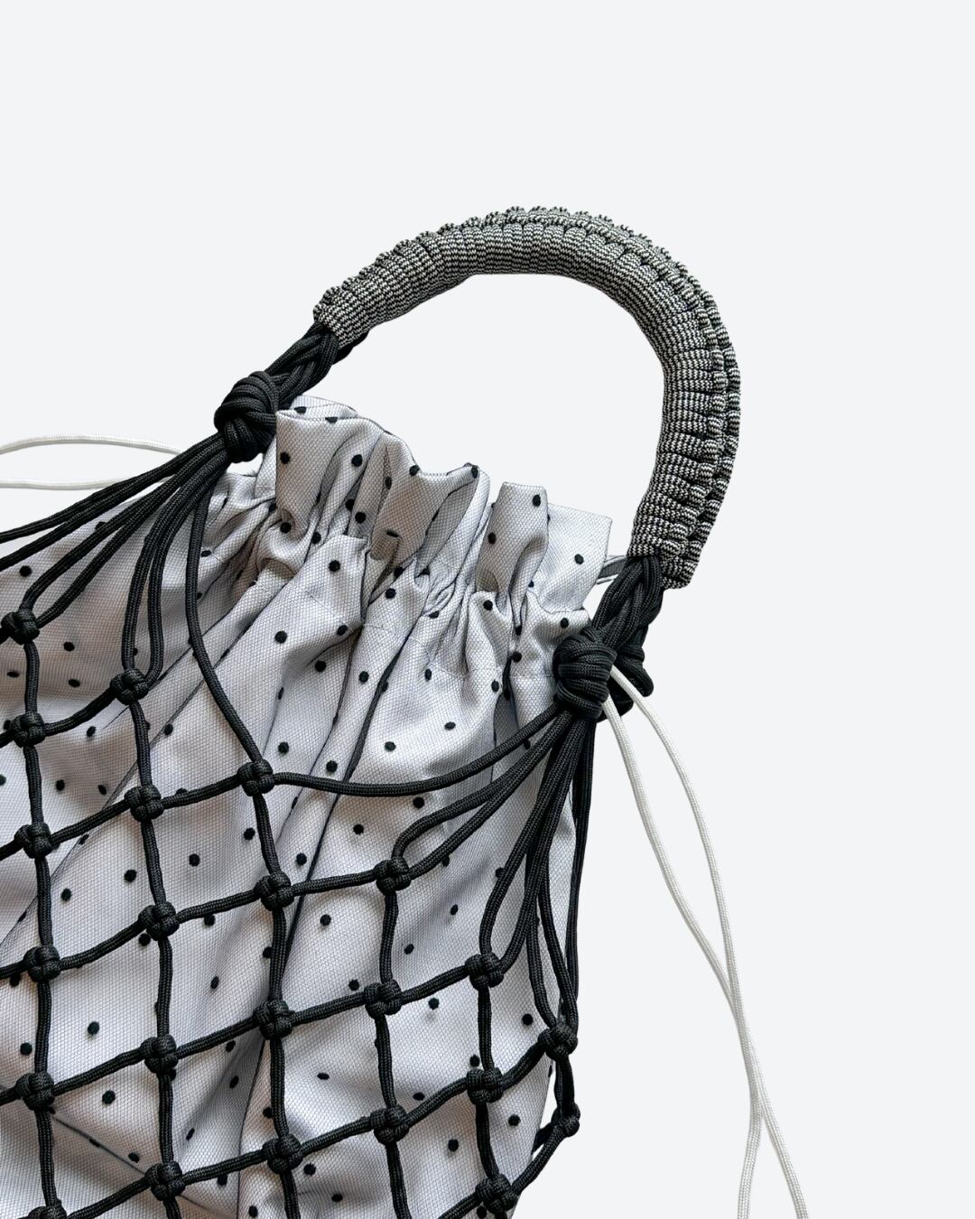 黒とパンダ柄のパラコードを使ったネットバッグにドット柄の巾着を合わせた可愛さとクールさを持ち合わせたバッグです!
