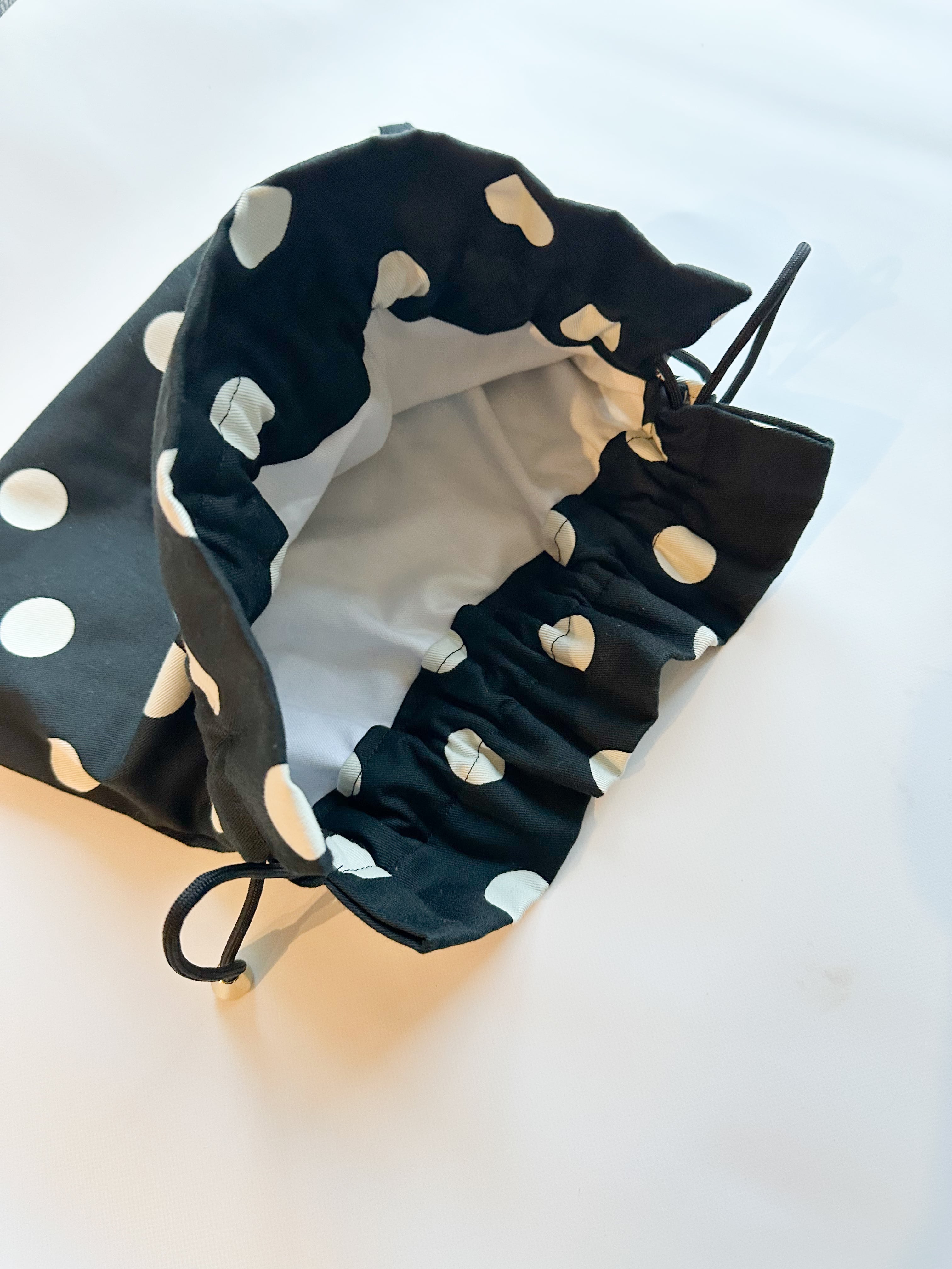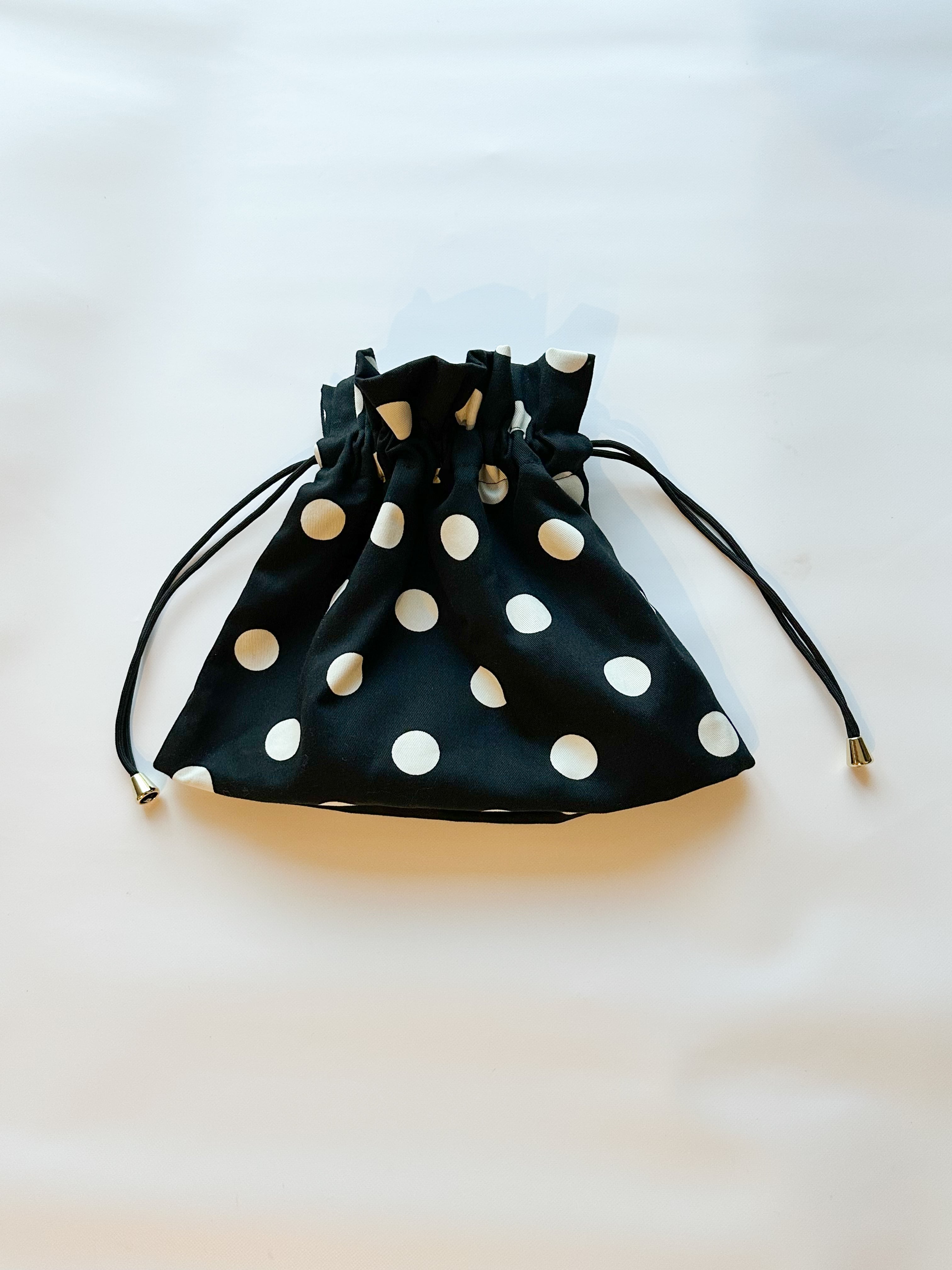 巾着紐は黒、ループエンドの金具はゴールドを使用しています。