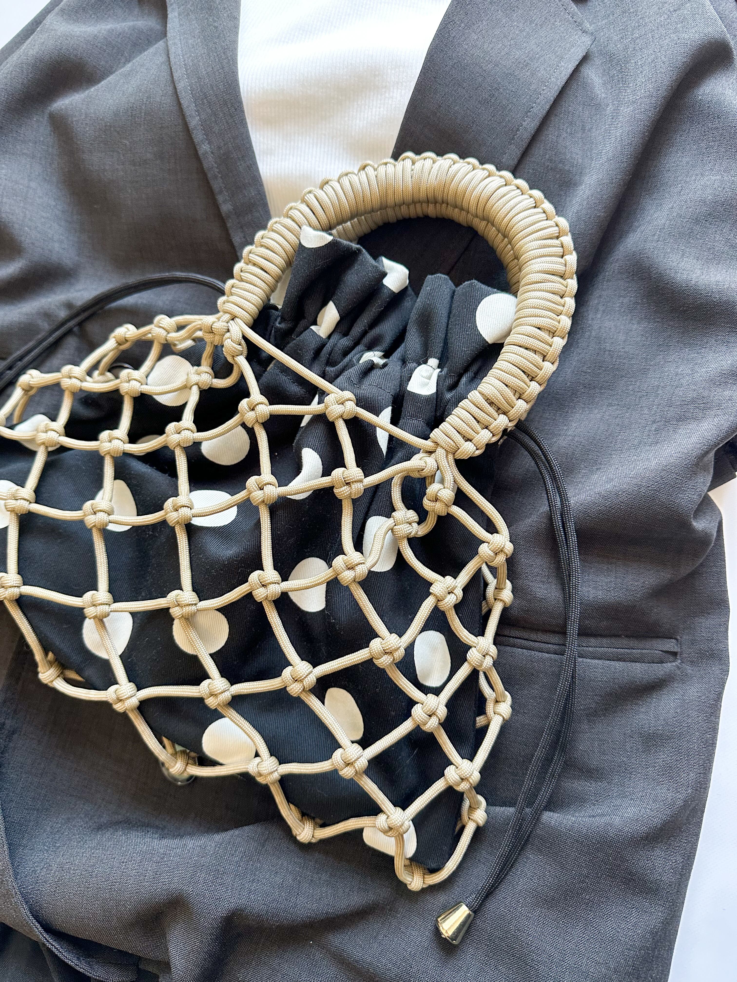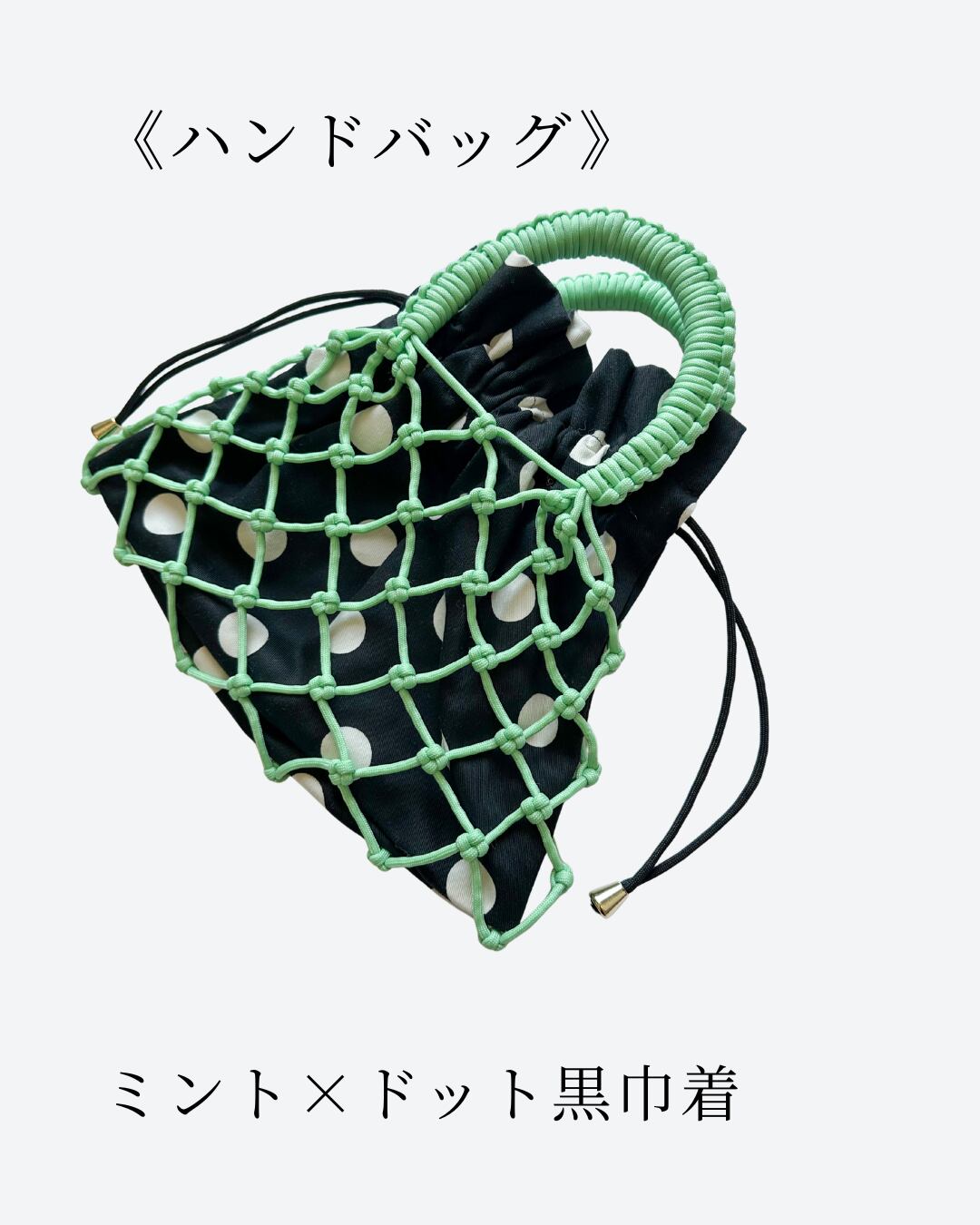 黒地に白のドット柄の、トレンドをおさえた巾着。